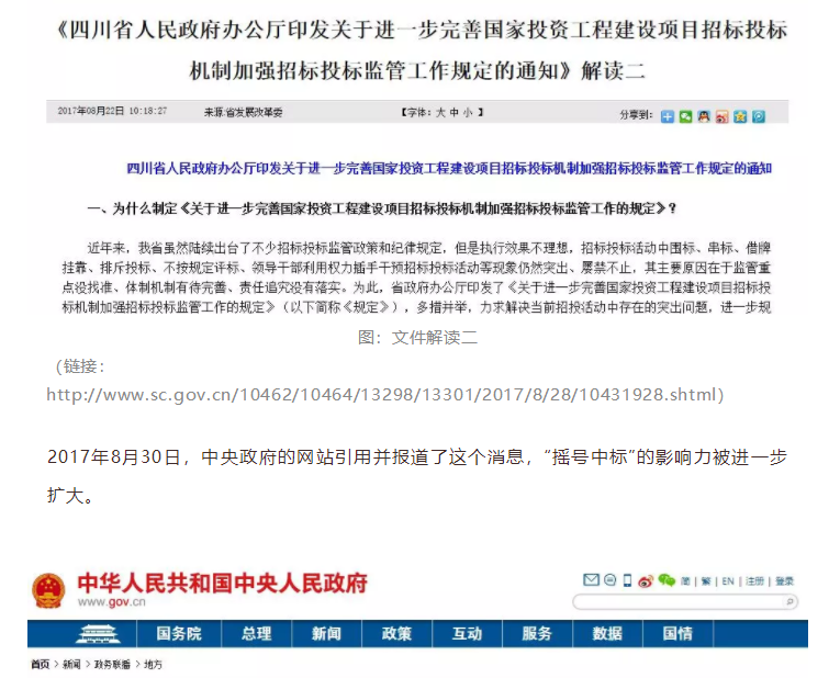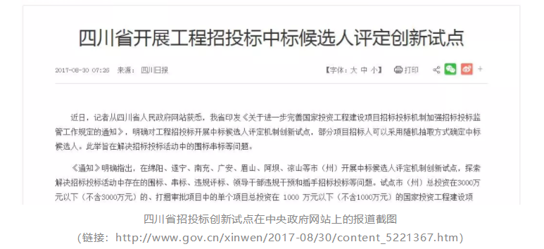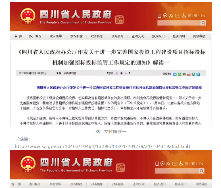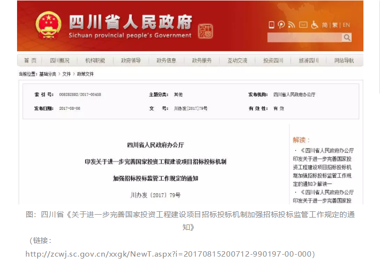 2017年8月6日,四川省人民政府辦公廳印發(fā)《關于進一步完善國家投資工程建設項目招標投標機制加強招標投標監(jiān)管工作規(guī)定的通知》(川辦發(fā)〔2017〕79號)。該省為推廣該項招投標舉措,還在政府官方網站上做出了兩個權威解讀文件。
