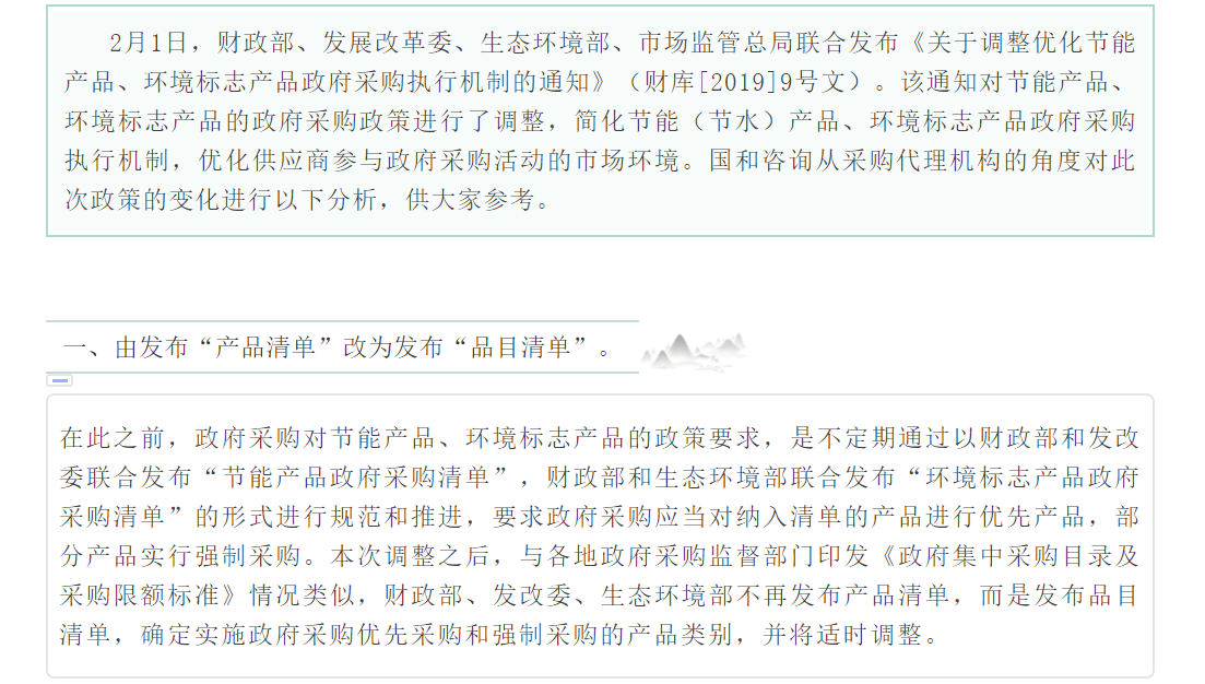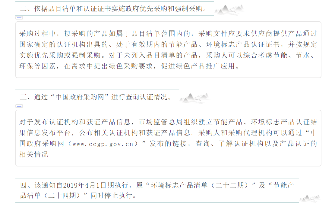 一、 對(duì)政府采購節(jié)能產(chǎn)品、環(huán)境標(biāo)志產(chǎn)品實(shí)施品目清單管理。財(cái)政部、發(fā)展改革委、生態(tài)環(huán)境部等部門根據(jù)產(chǎn)品節(jié)能環(huán)保性能、技術(shù)水平和市場(chǎng)成熟程度等因素,確定實(shí)施政府優(yōu)先采購和強(qiáng)制采購的產(chǎn)品類別及所依據(jù)的相關(guān)標(biāo)準(zhǔn)規(guī)范,以品目清單的形式發(fā)布并適時(shí)調(diào)整。不再發(fā)布“節(jié)能產(chǎn)品政府采購清單”和“環(huán)境標(biāo)志產(chǎn)品政府采購清單”。