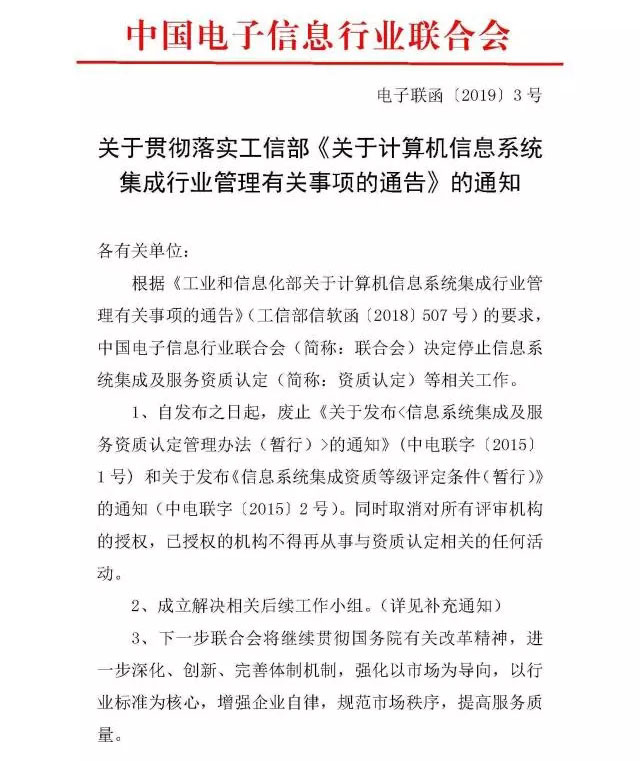 2014年3月,工信部發(fā)布《關(guān)于做好取消計(jì)算機(jī)信息系統(tǒng)集成企業(yè)資質(zhì)認(rèn)定等行政審批事項(xiàng)相關(guān)工作的通知》通知表明,該資質(zhì)認(rèn)定在取消行政審批后,認(rèn)定工作相移交給中國(guó)電子信息行業(yè)聯(lián)合會(huì)負(fù)責(zé)實(shí)施。