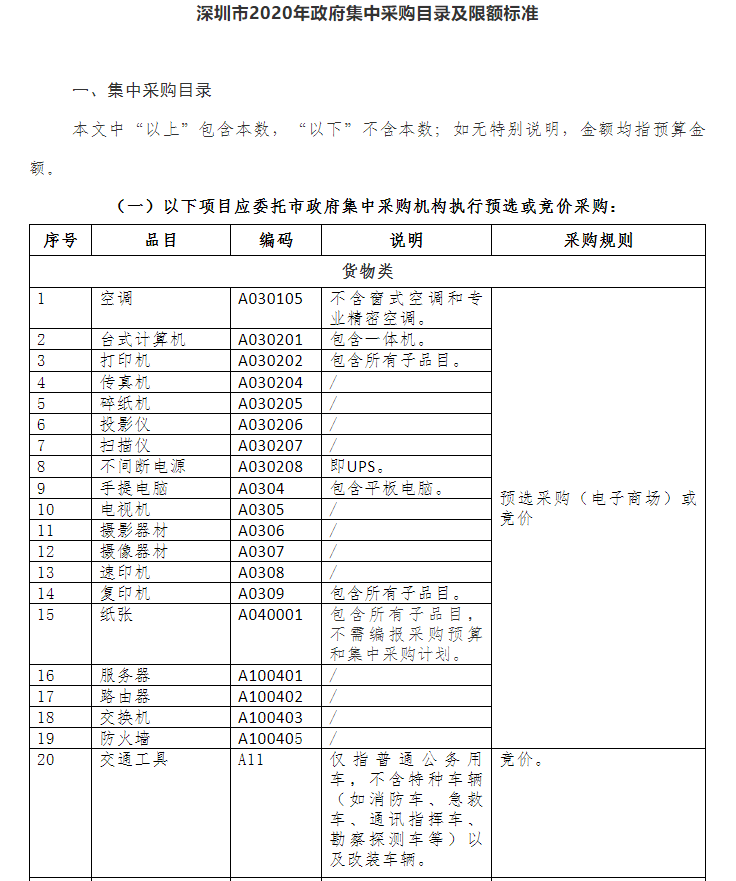 根據(jù)《深圳經(jīng)濟(jì)特區(qū)政府采購條例》、財政部《地方預(yù)算單位政府集中采購目錄及標(biāo)準(zhǔn)指引(2020年版)》以及省財政廳有關(guān)通知文件的規(guī)定,我局制定了《深圳市2020年政府集中采購目錄及限額標(biāo)準(zhǔn)》,已經(jīng)市政府批準(zhǔn),現(xiàn)印發(fā)給你們,自公布之日起執(zhí)行。